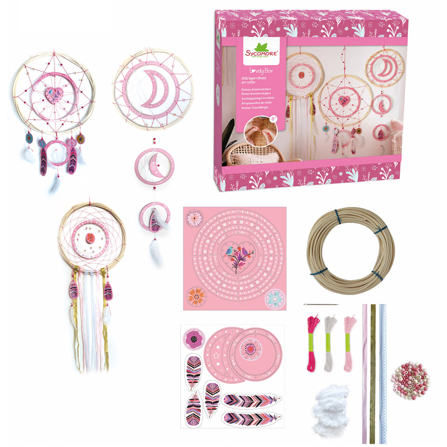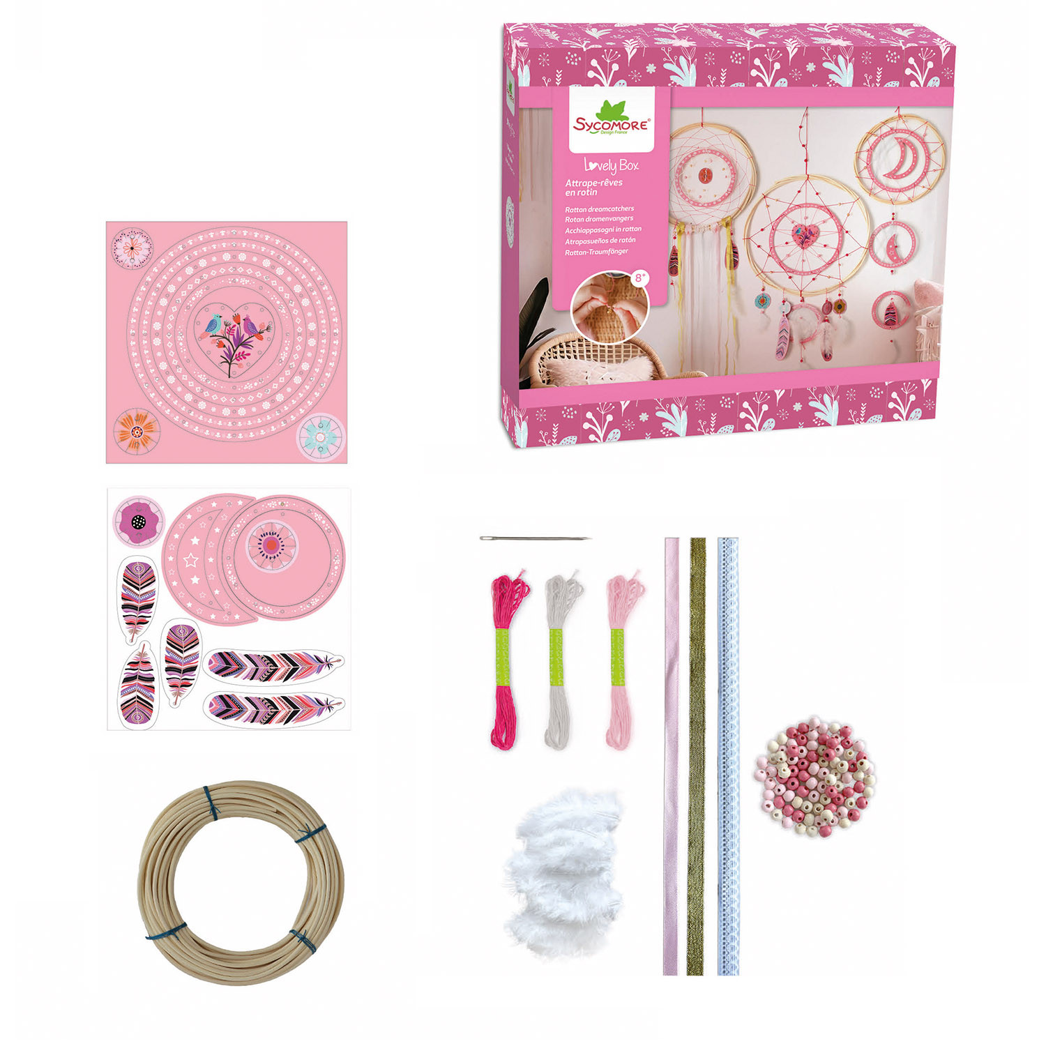 Set vsebuje: 1 potiskano predrezano ploščo, 3 ratanaste obroče, 1 kavelj, vrvico, peresa, bombažne niti (4 barve), trakove (3 barve), čipko, lesene kroglice (4 barve), kroglice, lesene obeske, 2 cofka, 1 iglo in knjižico z navodili.