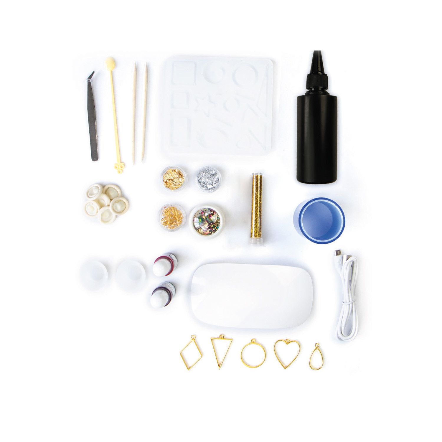 Komplet vsebuje: 1 UV lučko, UV smolo, sponke, verižico, prstane, uhane, lepilo za nakit, orodje za nakit (rezalnik in klešče) ter navodila z različnimi modeli.